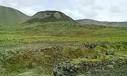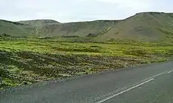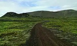 Despite its location, just some 5 km from the high temperature area of Seltún, the volcano and its counterparts, the crater rows, fissures, as well as the tuya Geitahlíð (385 m[1]) with the crater Æsubúðir [ˈaiːsʏˌpuːðɪr̥] on its top,[2] are not part of the Krýsuvík volcanic system, but of the volcanic system of Brennisteinsfjöll as its southernmost outpost.[4]