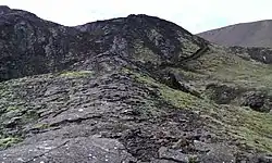 Another such eruption fissure is to be found nearby, therefore Icelanders prefer the plural Eldborgir undir Geitahlíð.[5] One of the eruption fissures dissects the older tuya Geitahlíð.