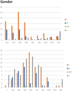 Tombs dated to the Latial period IIA contain grave goods whose gender associations in the Latial period I are incongruent with the biological sex of the deceased. One tomb from the Forum of Caesar contains a biologically female individual buried with arch fibulae, a hair rang, necklaces and a serpentine fibula and another grave from the Forum Romanum that likely contained a female individual also includes a serpentine fibula. The necropolis at the Forum Romanum also contains a grave belonging to a male individual that itself includes a spindle whorl as a burial good.[98] One grave from Osteria likely contains the skeleton of a biologically male individual who was interred alongside a necklace, a spindle whorl, hair rings, and an arch bow fibula. The presence of traditionally feminine ornaments within the burial of a likely biologically male individual compelled the archaeologist Lisa Cougle to suggest that the deceased was transgender, although the archaeologist Cecilie Brøns suggests that the individual may have been viewed as more feminine as their death occurred prior to reaching adulthood.[23] The cemetery at Osteria may reveal two other transgender burials, as two separate possibly male individuals appear entombed with arch bow fibulae and spindle whorls. However, the sex determinations of these skeletons may be unreliable, as the sex of one skeleton can only be ascertained via analysis of their tooth size, whereas the sex of the second skeleton can only be discerned based upon several fragments of their crania.[23]