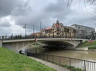 In 1890, a public tender was issued for replacing the wooden bridge, and the contract was granted to the Reșița Railway Company, led by engineer Henrik Reiber.[2] The Reiber family had constructed several significant buildings in the city, with the Dicasterial Palace being the most notable. However, due to bureaucratic delays, the bridge's construction was postponed. The steel bridge was ultimately finished in 1891, featuring a 30-meter opening, a 5.6-meter-wide roadway, and two pedestrian walkways, each 1.5 meters wide.[3] It was officially opened during the South Hungarian Industrial and Agricultural Exhibition held in Timișoara. With Emperor Franz Joseph in attendance, it was subsequently referred to as the Franz Joseph Bridge.[1]