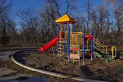 In May 2011, the park was inundated with floodwaters from the Missouri River, with water levels reaching their peak of 19.24 feet (6 m) on July 1, 2011. Once the flood had abated, Bismarck Parks and Recreation District commissioned a visual survey of the damage caused by saturated soil conditions and wind storms. Over 1,200 trees had been toppled or partially uprooted. The report concluded that replanting should increase the diversity of tree species to reduce the losses if an insect or disease were to enter the park, and also ensure introduction of species with known tolerance of flooding.[7] Campgrounds were closed for the season while the cleanup took place.[9] By November 2011, around three-quarters of damaged and fallen trees had been removed by forestry crews.[10]