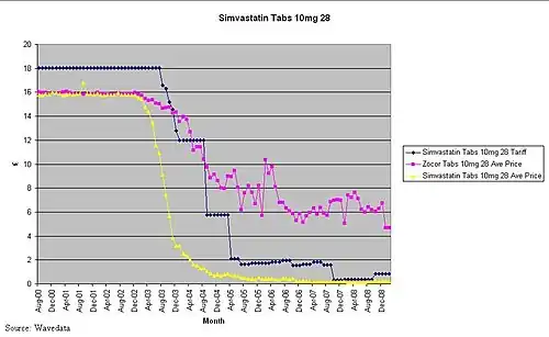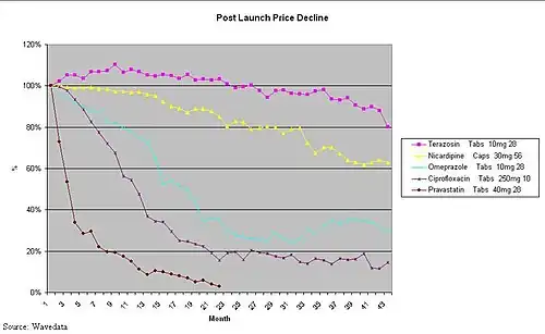 Generic pharmaceutical price decay is what happens (in the UK) once the originator brand has lost its patent exclusivity (patent expiry) and generic versions of the originator brand have been launched.[1][2][3][4][5][6]