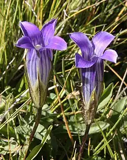 Gentianopsis holopetala is a species of flowering plant in the gentian family known by the common names Sierra fringed gentian or just "Sierra gentian"'. It is native to the Sierra Nevada and adjacent mountains in California and Nevada, in wet meadows from 6000 to 11,000 ft in elevation.[1] This is an annual or perennial herb, growing stems which may be anywhere from a few centimeters long to nearly half a meter, and may lay along the ground or grow erect. Its small oval or spoon-shaped leaves are mostly basal but may grow sparsely further along the stem.