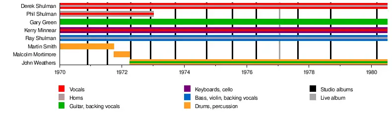 Gentle Giant was formed in 1970 when the Shulman brothers teamed up with two other multi-instrumentalists, Gary Green (guitar, mandolin, recorder etc.) and Kerry Minnear (keyboards, vibraphone, cello, etc.), plus drummer Martin Smith, who had previously drummed for Simon Dupree and the Big Sound.[5] The classically trained Minnear had recently graduated from the Royal College of Music with a degree in composition, and had played with the band Rust. Green was essentially a blues player and had never worked with a band above the semi-professional level, but adapted readily to the demanding music of the new band. The Shulman brothers, meanwhile, settled into typically multi-instrumental roles of their own — Derek on saxophone and recorder; Ray on bass and violin; and Phil on saxophone, trumpet, and clarinet (with all three brothers playing other instruments as and when required).