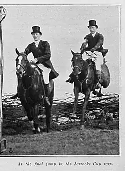Geoffrey Phipps-Hornby (left) winning the Jorrocks Cup at the Rifle Brigade Point-to-Point Races held at Chawton, near Alton, Hampshire, in 1909.[11]