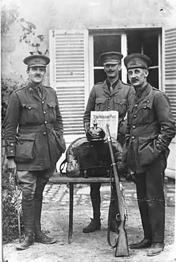 1. ^ Although this photograph is not dated, the pristine appearance of the captured German equipment suggests it comes from the first weeks of the war: it was quickly discovered by both sides that the glint of sunlight on the highly polished metal beloved of sergeant-majors everywhere soon attracted the unwanted attentions of enemy artillery.