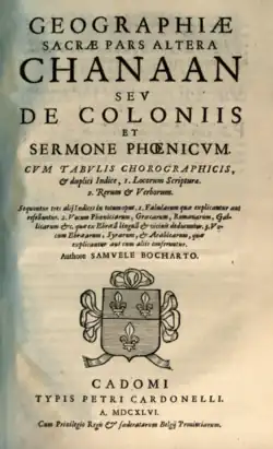 The first volume, entitled Phaleg, seu de Dispersione Gentium et Terrarum Divisione Facta in Aedificatione Turris Babel ("Peleg or the Dispersion of Nations and the Division of Lands Made in the Building of the Tower of Babel"), was devoted to the Generations of Noah and the modern names of the tribes lists in Genesis 10. The second book, originally entitled Chanaan seu de Coloniis Et Sermone Phoenicum ("Canaan or On the Colonies and the Phoenician Language"), studied the history of Phoenician colonization and the Phoenician and Punic languages.[1][2] The work was highly influential in seventeenth-century Biblical exegesis and modern Phoenician historiography.