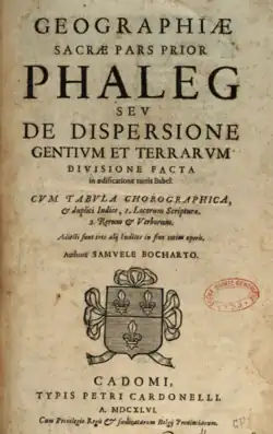 Bochart's goal was to reconstruct the historical geography of the ancient world by studying biblical philology.[7] The name Phaleg / Peleg refers to Genesis 10:25 and 1 Chronicles 1:19, which state that it was during the time of Peleg that the earth was divided.