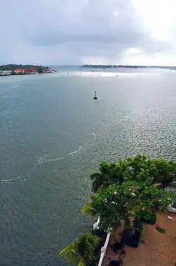 Kochi lies at the northern end of a narrow neck of land, about 19 km long and less than 1.6 km wide in many places, and is separated from the mainland by inlets from the Arabian sea and by the estuaries of rivers draining from the Western Ghats. As a result, Kochi is a natural harbour.
