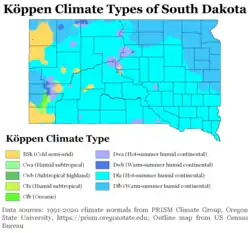 Köppen climate types of South Dakota, using 1991-2020 climate normals.