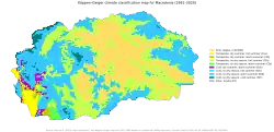 North Macedonia has a unique climate explained by its location and topography. The climate of the plains is a Mediterranean climate combined with the influence of the Black Sea.[1] The country also holds continental characteristics, which are accentuated by the mountains in the south which prevent hot air from the south from moving to the north. Conversely, the Šar Mountains, which are located in the northwestern part, block cold northern winds. In whole, the northern and western parts of the country are relatively close to a Continental climate and the southern and eastern to a Mediterranean climate.[2]