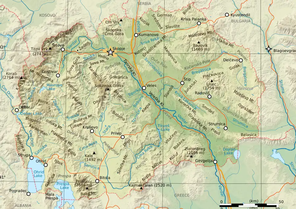 | Lowest point | Vardar River (near Gevgelija), 50 m |