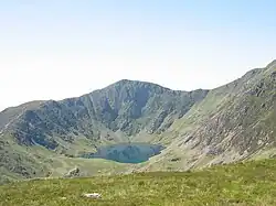 Examples of mass movement are not common in Snowdonia but there is a concentration along the glacially excavated Bala lineament through Talyllyn. The largest is that which originates on the steep northwest slopes of Graig Goch and which has resulted in a mass of debris up to 30m high covering the otherwise flat floor of this trough and behind which is the lake.[14] There are further smaller examples which form Bwlch Cyfyng southwest of Abergynolwyn and on the southeastern slopes of Mynydd Gwerngraig east of Cadair Idris. A further mass of slipped material is recorded beneath the peak of Pen yr Helgi Du at the head of Cwm Eigiau.[15]
