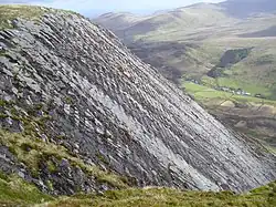 The Clogau Formation, a thickness of black mudstones, together with the late Cambrian age Maentwrog, Ffestiniog Flags and Dolgellau formations are assigned to the Mawddach Group. These too are largely turbidites though the Dolgellau Formation is a dark pyritic mudstone. The exposures of Cambrian age rocks along the park's northwestern boundary differ though the rocks of the lowermost Fachwen Formation can be equated to those of the Dolwen Formation, similarly the Llanberis Slates Formation can be correlated with the rocks of the Llanbedr Formation. The middle Cambrian succession is missing here and the upper Cambrian succession locally comprises the sandstones of the Bronllwyd Grits Formation and the overlying mudstones, siltstones and sandstones of the Marchlyn Formation, correlating with the Ffestiniog Flags. The uppermost part of the Marchlyn, a series of interbedded sandstones and conglomerates, are referred to as the Carnedd y Filiast Grit. An outcrop of this grit at Cwm Graianog displays distinctive ripple-marked bedding on an inclined bedding plane known to rock-climbers as 'Atlantic Slab' (Welsh: Llechen Cytrolar).[6][7][8]