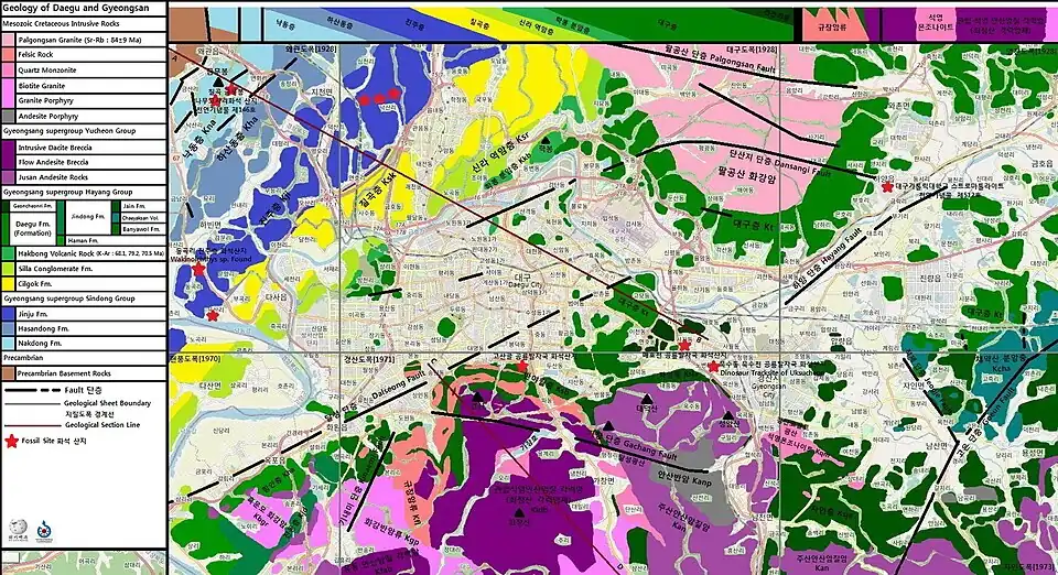 The Gyeongsang Basin is composed of the Gyeongsang Supergroup, which consists of Sindong, Hayang, Yucheon group, and Bulguksa Granite. The Sindong Group is the lowest stratigraphic sequence in the Cretaceous Gyeongsang Basin and comprises three stratigraphic units: the Nakdong, Hasandong, and Jinju Formation in ascending order.[19] Hayang group is mid group of Gyeongsang supergroup.[20] Yucheon group is the top group of Gyeongsang supergroup.[21]