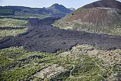 At about 2.7 Ma, in the late Pliocene Epoch, the rejuvenation stage began. It produced much less lava than the earlier shield stage, mainly at the Montaña Roja and Montaña Bermeja volcanoes in southern Lanzarote.[61] Then, throughout the subsequent Pleistocene and Holocene epochs, the rejuvenation volcanism has continued and has been dominated by strombolian-style eruptions of lava from sets of volcanic cones aligned along numerous northeast–southwest fissures in the central part of Lanzarote.[65] Geologically recent examples of Lanzarote's rejuvenation stage volcanism include eruptions at Montaña Corona (about 21,000 years ago), Timanfaya (1730–1736) and Tao/Nuevo del Fuego/Tinguatón (1824).[66][32][67]