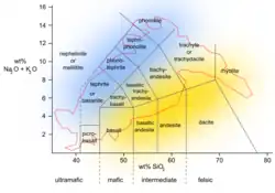 Volcanic rock types found on the Canary Islands are typical of oceanic islands. The volcanic rocks include alkali basalts, basanites, phonolites, trachytes, nephelinites, trachyandesites, tephrites and rhyolites.[25][3] There are lava flows as well as deposits of pyroclastic material, such as tuff (made of volcanic ash or lapilli).