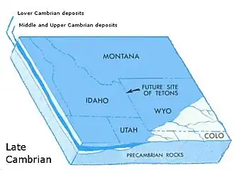 Early in Cambrian time a shallow seaway, called the Cordilleran trough, extended from southern California northeastward across Nevada into Utah and Idaho.[7] The vast gently rolling plain on Precambrian rocks to the east was drained by sluggish westward-flowing rivers that carried sand and mud into the sea. The site of the Teton Range was part of this plain. Slow subsidence of the land caused the sea to spread gradually eastward during Middle Cambrian time flooding the Precambrian plain. Sand accumulated along the beaches just as it does today. As the sea moved still farther east, mud was deposited on the now-submerged beach sand. In the Teton area, the oldest sand deposit is the 175 to 200 feet (53 to 61 m) thick Flathead Sandstone.[7] The partly marine Flathead Sandstone is reddish-brown, very hard, brittle and exposures can be found on the north and west flanks of the Teton Range and Gros Ventre Range.