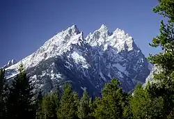 Sometime around 2.5 billion years ago, blobs of magma intruded into the older rock, forming plutons of granitic rock.[3] Extensive exposures of this rock are found in the central part of the range. About 1.3 to 1.4 billion years ago in Late Precambrian, 5-to-200-foot (1.5 to 61.0 m) thick black diabase dikes intruded as well, forming the prominent vertical dikes seen today on the faces of Mount Moran and Middle Teton (the dike on Mount Moran is 150 feet (46 m)).[3][4] Some of the large dikes can be seen from the Jenny Lake and String Lake areas.