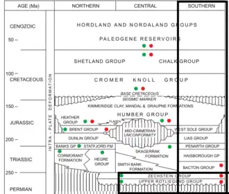 - ^ a b Yielding, Graham; Lykakis, Nikos; Underhill, John (2011). "The role of stratigraphic juxtaposition for seal integrity in proven CO2 fault-bound traps of the Southern North Sea". Petroleum Geoscience. 17 (2): 193–203. doi:10.1144/1354-0793/10-026. S2CID 131669132.