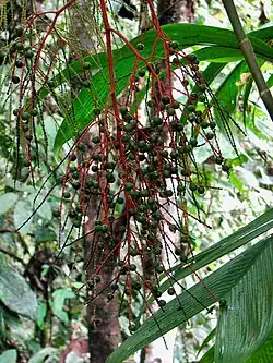 This species has a highly branching inflorescence below the plant leaves. There can be second and third order branching.[7] [5] As seen in other species of the genus Geonoma, the flowers of G. undata are imperfect and very small. They are located in pits which are organized in a spiral arrangement on rachillae.[5][9] Staminate and pistillate flowers occur in clusters of three with one pistillate flower, and two staminate flowers in each cluster.[7] Staminate flowers fall off after maturity while the pistillate flowers remain on the plant. The staminate flowers have six stamen with short anthers curling at maturity.[5] The perianth of both staminate and pistillate flowers is composed of three sepals and three petals. However, there is a difference between male and female flowers. In staminate flowers, the sepals are distinct, narrow and rounded at the apex. The petals are basally connate and the anthers have valvular dehiscence. Meanwhile, pistillate flowers exhibit basal connation in both sepals and petals. The pistil is composed of three carpels, an elongate style, and three stigmas.[10] Neither pistillate nor staminate flowers emerge very far out from the pit in which they are located.[5] The pistillate receptacle is anywhere between 12 and 47 cm long and has a reddish tone when the flower is developing fruit.[7]