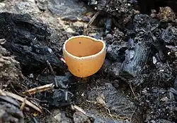 The specific epithet carbonaria derives from the Latin word for "charcoal".[9] Common names given to the fungus include "charcoal loving elf-cup", "dwarf acorn cup",[10] "pixie cup",[11] and the British Mycological Society approved "stalked bonfire cup".[12]