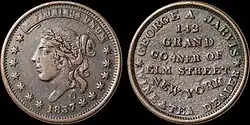At 18 years of age, Jarvis went to New York. His uncle, Noah Jarvis, let him live in his home and made an arrangement with a wool store for George to work as an apprentice with no pay for a year while he learned the business. The second year, he was paid for his work. Within the third year, the economy crashed. Jarvis lost his position at the store and, because of the poor economy, he was unable to find another position.[2] Noah hired his nephew to assist him in the collection of assessments and he performed well. Noah provided a loan so that George could establish a grocery business near Broadway on Grand Street. George repaid the loan, with interest, within several years.[2] George was a wine and tea dealer. He issued copper hard times tokens with his address 142 Grand near Elm, a bust image of Liberty, and the year 1837.[7] He cofounded a wholesale grocery business, Stanton and Jarvis,[8] in September 1838.[2]