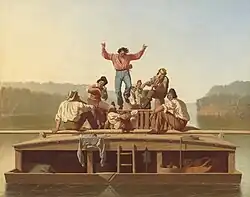 George Caleb Bingham (March 20, 1811 – July 7, 1879) was an American artist, soldier and politician known in his lifetime as "the Missouri Artist".[1] Initially a Whig, he was elected as a delegate to the Missouri legislature before the American Civil War where he fought against the extension of slavery westward. During that war, although born in Virginia, Bingham was dedicated to the Union cause and became captain of a volunteer company which helped keep the state from joining the Confederacy, and then served four years as Missouri's treasurer. During his final years, Bingham held several offices in Kansas City, while also serving as Missouri's Adjutant General.[2] His paintings of American frontier life along the Missouri River exemplify the Luminist style.[3]