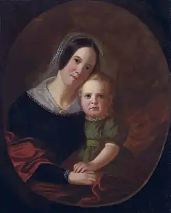 In 1836, the year Missouri expanded with the Platte Purchase of former Native American territory (thus violating the Missouri Compromise of 1820 which had led to the state's creation), 25-year-old Bingham married 18-year-old Sarah Elizabeth Hutchison (1818–1848), who bore him four children before her death. From 1837 to 1845 they lived in Arrow Rock in Saline County, where their house has been designated a National Historic Landmark. She died in 1848 at the age of twenty-nine.[6] Bingham's mother Mary helped him raise his children before she died in 1851.[6]