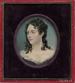 George Catlin met Clara Bartlett Gregory in 1828 in her hometown of Albany, New York. She was eager to escape her family home, not getting along with her father's third wife. After a brief courtship, Clara and George married on May 11, 1828. She was 19, and Catlin was 32.[21] After their marriage, she accompanied him on one of his journeys west. They eventually had four children.[22] Clara and his youngest son died of consumption while visiting Paris in 1845.[23]