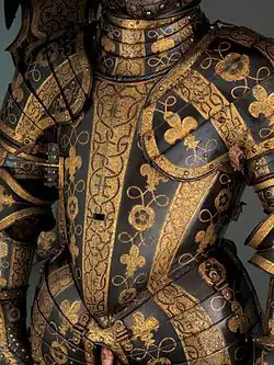 The armour is of blued steel and is etched and inlaid with elaborate gilded designs, incorporating columns of alternating fleurs-de-lis and Tudor roses, with the letter E for Queen Elizabeth I. It is on display in the Armor Court at the Metropolitan Museum of Art in New York, next to the two suits of armour of Sir James Scudamore, which were also made at the Greenwich armoury.