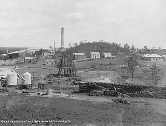 The two prospectors, William Brookman and Sam Pearce, left Adelaide for Perth on 7 June 1893 aboard the steamer Australia. They travelled east to York where they purchased a spring-dray and two horses in order to convey their equipment and supplies. The pair arrived at Coolgardie on 29 June, where a claim had been offered for sale to the syndicate, but after inspection they decided to decline the sale. Twelve days before their arrival the prospector Paddy Hannan had registered a find of payable gold, by he and his two partners, at a location 24 miles (38 km) to the north-east of Coolgardie. Within days a rush had begun to the location that became known as 'Hannan's Find' (and later Kalgoorlie). Brookman and Pearce decided to visit the new goldfield. Most of the early diggers were searching for alluvial gold, but the two Adelaide miners had purchased a dolly pot to crush quartz samples from potentially gold-bearing reefs.[34] While they were camped on a six-acre block in the ironstone hills to the south of 'Hannans' (later known as Central Boulder), leased by miners named Flynn and Tucker, the two prospectors dollied some stone for the owners. The results were exceedingly good and the next morning Pearce pegged out the nearby Ivanhoe lease, "situated on a low, scrubby hill, with ironstone blows surrounding it, and contains no less than five well-defined quartzite and iron reefs".[35][36][24] While Brookman was away in Coolgardie to register the Ivanhoe lease, Pearce discovered a large gold-rich reef at a nearby location, that became known as the Great Boulder claim.[35][34]