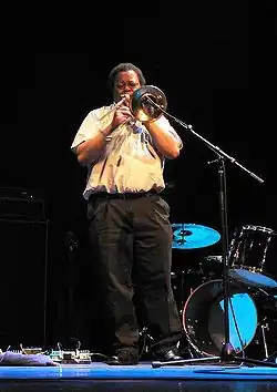 His parents wanted him to learn an instrument as a way to make friends, and Lewis chose the trombone, which was paid for in monthly installments.[4]: 281  He played in the school orchestra and concert band, took private lessons from University of Chicago graduate students, and as a teenager joined the school's new jazz band, run by jazz historian Frank Tirro (then working on his PhD) and Dean Hey.[4]: 282  In the late 1960s, classmate Ray Anderson took Lewis to hear Fred Anderson at an AACM concert, and Lewis first heard the Art Ensemble of Chicago at another concert on his high school campus.[4]: 282