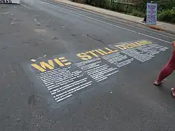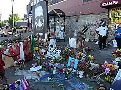 Local unrest in Minneapolis–Saint Paul immediately after Floyd's murder was the second-most destructive to property in U.S. history, after the 1992 Los Angeles riots,[14] but peaceful protest gatherings at the intersection in late May 2020 were free of the property destruction, arson, and looting that characterized other local demonstrations.[15][16] The intersection became a place of pilgrimage for people protesting Floyd's murder and other forms of racial injustice.[17] But in the weeks and months after Floyd's murder, the neighborhood surrounding the square, which had previously had a reputation for gang activity, continued to have elevated levels of violent crime and regular gunfire incidents.[17] By August 14, 2022, seven people had been killed by gun violence at or around the square since Floyd's murder,[18][1][19][20][21][22][23] and one person had died there as the result of a drug overdose.[24]