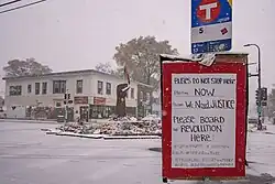 The intersection remained an active site of protest two years after Floyd's murder as the city began a multi-year project to redesign the streetscape and plan a permanent memorial.[116][122] Some community members and businesses supported efforts to establish a permanent memorial and resume bus service on Chicago Avenue, which had been suspended for two years.[123] Some activists insisted the site continue to be a place of active protest until their demands were met and posted a manifesto at the square that stated their opposition to a city-commissioned memorial.[124][122]