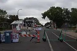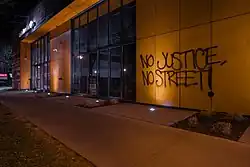 As a reaction to the murder of George Floyd on May 25, 2020, racial justice activists and some residents of the Powderhorn community in Minneapolis staged an occupation protest at the intersection of East 38th Street and Chicago Avenue with a blockade of the streetway lasting over a year.[5][6][7] The intersection is where Derek Chauvin, a white police officer with the Minneapolis Police Department, murdered George Floyd, an unarmed 46-year-old Black man.[8] Activists erected barricades to block vehicular traffic and transformed the intersection and surrounding structures with amenities, social services, and public art depicting Floyd and other racial justice themes.[2][9][7] The community called the unofficial memorial and protest zone at the intersection "George Floyd Square". The controversial[10] street occupation in 2020 and 2021 was described as an "autonomous zone" and a "no-go" place for police,[11] but local officials disputed the extent of such characterizations.[12][13]