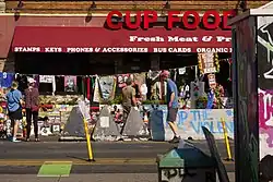 On August 3,[53] the reopening of the Cup Foods convenience store, from which an employee's 911 call led to the encounter between Floyd and Minneapolis police, generated controversy. Cup Foods, owned by a Palestinian-American family, had been a fixture in the Powderhorn neighborhood for three decades. The area around it had also been the location of violent crime, illicit drug dealing, loitering, and undercover police surveillance since the 1990s.[54] Floyd's murder led to further scrutiny of the store and its relationship with the Minneapolis police and its off-duty officers who were known to provide paid security services. When it reopened, some protesters demanded that the store remain closed for continued mourning and confronted its owners, who vowed to keep the store open.[55][54] Among public conversation about how to evolve the intersection into a permanent memorial, some activists circulated petitions to permanently close the store.[53]