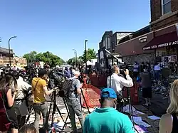 On May 26, 2020, the day after Floyd's murder, several videos by witnesses and security camera footage of the incident circulated widely in the media, drawing public scrutiny.[38][39] A makeshift memorial emerged at East 38th Street and Chicago Avenue[40] and people gathered for the first organized protests.[41] Some protesters chanted, "I can't breathe, I can't breathe", words repeated by Floyd in videos of his murder.[42] Thousands of people flooded the intersection that day.[43] By May 27, a group of protesters had blocked the intersection with a makeshift barrier as some repeated, "Whose streets? Our streets." People left memorials by Cup Foods and spray-painted the words "Justice for Floyd" and "Black Lives Matter" on the street surface. No police were present at the time and the protests there were described as peaceful.[44]