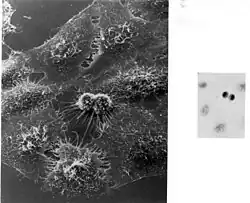 In 1951, Gey's research assistant, Mary Kubicek, isolated cells from a cervical tumor removed by a surgeon found in a woman named Henrietta Lacks. These cells proved to be very unusual in that they could grow in culture medium which was constantly stirred using the roller drum a technique developed by Gey; they did not need a glass surface to grow, and therefore they had no space limit.[3] Once Gey realized the longevity and hardiness of these cells which he called HeLa cells, he began sharing them with scientists all over the world, and the use of the HeLa cell line became widespread.[4] The cells were used in the development of the polio vaccine, led to the first clone of a human cell, helped in the discovery that humans have 46 chromosomes, and were used to develop in vitro fertilization. By the time Gey published a short abstract claiming some credit for the development of the line, the cells were already being used by scientists all over the world.[5]