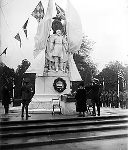 The memorial was formally dedicated on October 19, 1927, becoming one of the last Civil War monuments erected in Washington, D.C. By the time of the dedication, many of the GAR and Society of the Army of the Potomac members who championed the memorial had died and only a few Civil War veterans were able to attend the ceremony.[4] Prominent attendees at the ceremony included President Calvin Coolidge, his wife, Grace, Pennsylvania Governor John Stuchell Fisher, Secretary of the Navy Curtis D. Wilbur, Secretary of the Treasury Andrew W. Mellon, Secretary of Labor James J. Davis, and Senator Simeon D. Fess, the acting chairman of the memorial commission. White, temporary pavilions adorned with greenery, national shields, and the coat of arms of Pennsylvania were built around the memorial for invited guests and members of the public. The speaker's stand was decorated with palms, ferns, and autumn-colored flowers. On either side of the memorial was the national flag; the left flag from the Civil War era had 35 stars and the right flag was the current 48-starred flag.[6]