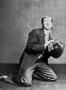 Grossmith took to the professional stage in 1870 with a sketch called Human Oddities, written by his father, and a song called "The Gay Photographer" (that is, the "carefree" photographer).[7] The song, with words by Grossmith's father and music by young Grossmith, concerns a photographer who broke the heart of a young lady named Miss Jenkins; so she drank his chemicals and died.[8] In late 1870, the younger Grossmith appeared on his own with a nightly spot at the "old Polytechnic" in Regent Street, where comic sketches alternated with scientific and serious lectures for the entertainment of the public.[5] Human Oddities and another sketch, The Yellow Dwarf, were successful for Grossmith, and he took the former work on tour for six months. An 1871 Grossmith sketch was called He was a Careful Man.[7] Biographer Tony Joseph notes that, except for a few early pieces, nearly all of Grossmith's material was written and composed by Grossmith himself. Joseph describes the sketches as "a light-hearted sending up of various aspects of contemporary life and manners. ...he was the complete performer... as a pianist (he performed for the most part sitting at a piano)... as a raconteur... as a mimic, facial expression, timing—he had it all. A short, dapper figure, he turned his lack of inches to positive advantage, and audiences took to him everywhere."[1]