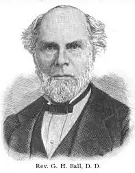 George H. Ball was born in 1819 near the city of Sherbrooke, Quebec to American parents from Massachusetts, William and Marcy (Harvey) Ball. In 1836 his family moved to Ohio. Rev. Ransom Dunn, a Free Will Baptist minister befriended Ball and introduced him to that denomination. Ball studied at Farmington Academy and Grand River Institute and received a license to preach in 1843 and moved to Canada to preach and teach. In 1847 Ball graduated from the Baptist Bible School (later named Cobb Divinity School at Bates College), which was then located in Whitestown, New York. Bates College later awarded Ball an honorary doctorate of divinity.[1] After giving them a loan, George Ball's nephews, the Ball brothers, developed the Ball canning jar and eventually founded Ball State University with the proceeds from this successful investment.[2]
