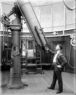 - Corbis photo with caption: Dr. George Henry Peters, of the U.S. Naval Observatory at Washington, with the 46 inch (1.2 m) lens, weighing 150 pounds (68 kg) and capable of taking a photo 195,000,000 miles (314,000,000 km) away, which is to be used to photograph total eclipse of sun on January 24.]