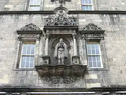 A statue of Heriot stands within the quadrangle of the school, above the pend on the north entrance tower. This is by Robert Mylne the King's Master Mason. It bears a Latin inscription which translates as: "This statue shows my body, this building shows my soul".[29]
