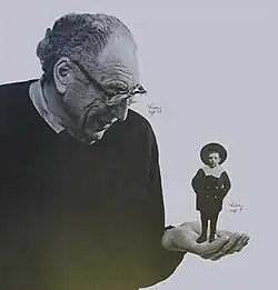 George Him aged 75, holding a photograph of himself age 5