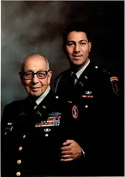 On August 31, 1951, Juskalian married Beatrice MacDougall, the widow of Lieutenant Jack W. Kirk, one of his first company commanders.[39][40] The marriage ended in divorce in 1958. In 1970, he married his second wife, Lucine Barsoumian, an Armenian from Aleppo, Syria.[35] They had a son named Kevork and a daughter named Elissa. Kevork graduated from George Mason University in May 1996 with a master's degree in international transactions and was later commissioned as a second lieutenant in the Regular Army.[41] Gregory, a son by his previous marriage with Beatrice MacDougall, lives in Stockbridge, Massachusetts.[41] George Juskalian was also the cousin of Medal of Honor recipient Ernest Dervishian who received the award while serving in the U.S. Army during World War II.[42]