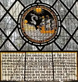 Sponsored by the Society for the Propagation of the Gospel in Foreign Parts, Keith returned to the American colonies as a missionary from 1702 to 1704, trying to win over Quakers and others. Keith invigorated Anglican congregations in Perth Amboy, Burlington and Concord Township, Pennsylvania.[9] He preached in Williamsburg, Virginia in 1703, and left behind his daughter, Anne, who had likewise returned to the Anglican fold, unlike her husband, Quaker George Walker of Old Point Comfort.[10]