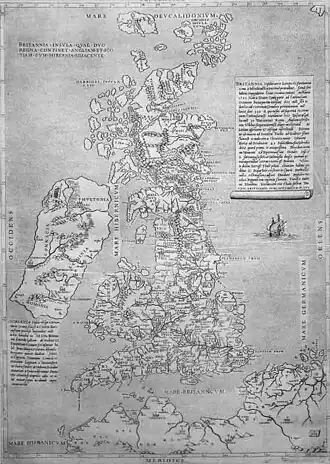 Almost certainly intended as a companion-piece to the Descriptio Britanniae, Lily drew the first map of the British Isles (at a reasonably detailed scale) to be printed.[3][4][5] It was engraved on two plates and published in Rome in 1546. The map is recognisably a relation of the 14th-century Gough Map, although the orientation has been reversed (West is at the top of the sheet), and many minor improvements have been made. The Scottish coastline, in particular, is considerably more accurate than that on the Gough Map, but Lily's sources for this are not known. The map was pirated on several occasions in Italy; and Lily and Pole appear to have carried the plates back to England with them, as they were reworked by the engraver Thomas Geminus for a London edition published in 1555.