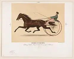 George M. Patchen, Brown Dick, and Miller's Damsel competed in a trotting race for a $500 purse at Union Course, Long Island, on July 7, 1859. The race was commemorated in a lithograph by Currier & Ives.[8] Sporting men and horse enthusiasts eagerly watched as George M. Patchen met Ethan Allen in 1860 at Union Course for a $2,000 harness race, best three out of five heats.[9] During that season, he twice beat Ethan Allen (2:25½) and Flora Temple (2:19¾), though she bested him nine times that season. In one of their matches at the Union Course, he won a heat in 2:23½—the fastest mile ever by a trotting stallion at the time.[4] Before his second two-mile heat in harness at Philadelphia's Suffolk Park in 1860, George M. Patchen was sold. The buyer was William Waltermire, a New York cattleman, who paid $20,000 to Joseph Hall.[10]