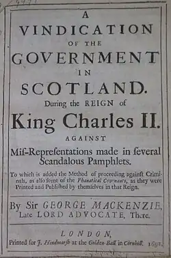 His Laws and Customs of Scotland in Matters Criminal (1678) was the first textbook of Scottish criminal law.[21] In it Mackenzie defended the use of judicial torture in Scotland as legal. He said it was seldom used.[22] In the aftermath of the Rye House Plot Charles II authorised the use of torture against William Spence, secretary to Archibald, Earl of Agyll, who was moved to Scotland. The Scottish privy council was reluctant, but eventually went beyond Scottish law in torturing Spence.[23] Mackenzie visited William Carstares in prison in London, caught up in the same investigation, to warn him of the consequences of stubborn behaviour under questioning.[22]